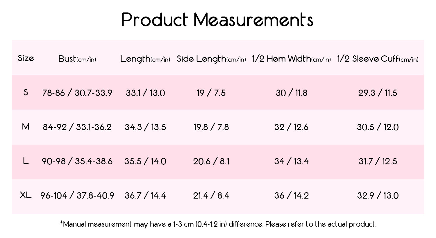 - Length (S–XL): approx. 13.0" – 14.4"