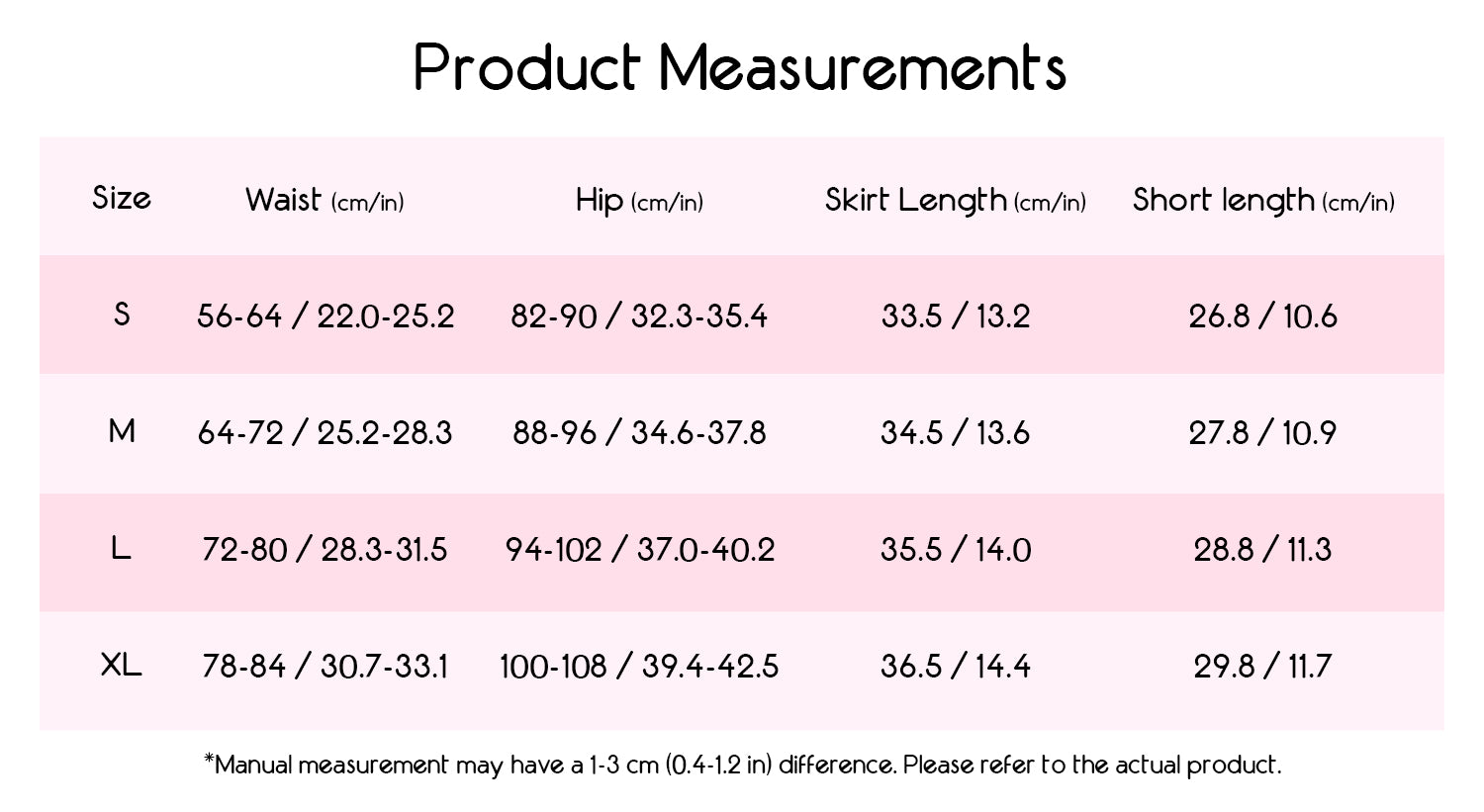 Skirt length (XS–XL): approx. 12.8" – 14.4"